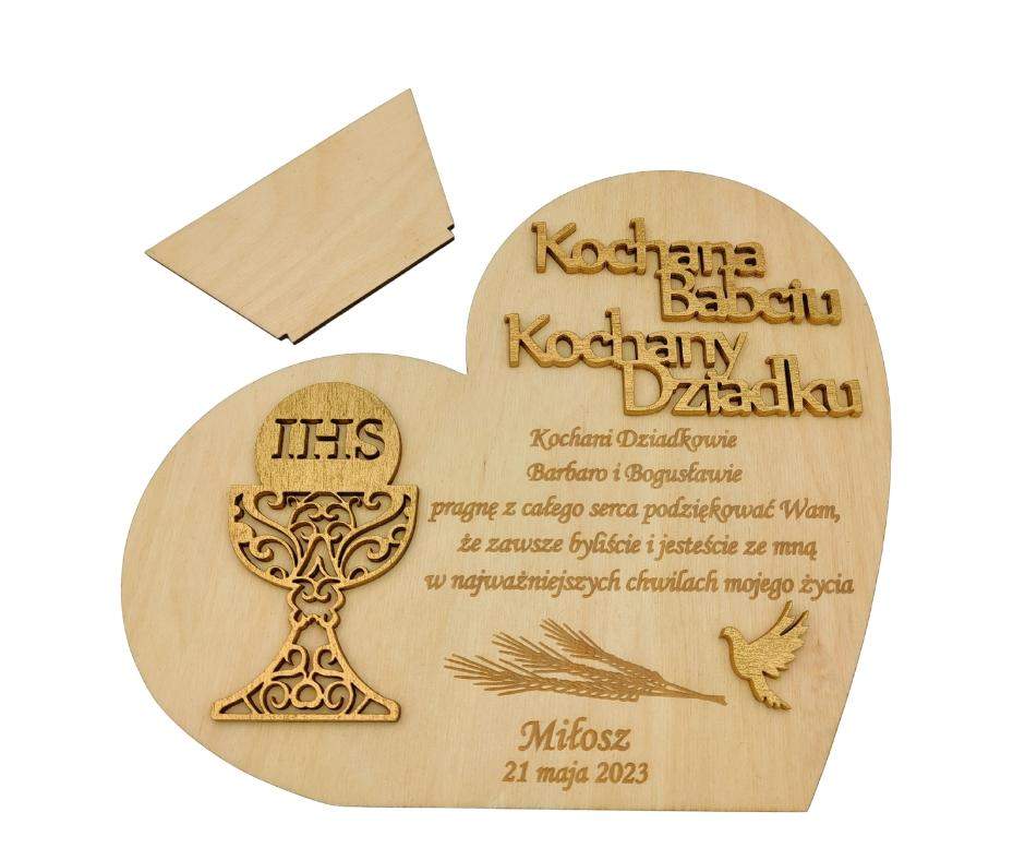 Piękne i starannie wykonane podziękowanie dla Babci i Dziaka które ładnie odda Państwa wdzięczność za przybycie tak ważnych osób. Statuetka ma wykonany indywidualny grawer na życzenie osoby kupującej. Rozumiemy również że nie wszyscy możemy być w komplecie na tej uroczystości więc jeżeli potrzebują Państwo podziękowania dla Babci lub Dziadka osobno to nic nie stoi na przeszkodzie! Prosimy tylko o taką informację. Lakierowane elementy są koloru złotego co podnosi elegancję ozdoby. Podziękowanie podparte jest również od tyłu dzięki czemu może ono stanąć na półce i pełnić rolę estetycznej pamiątki i ozdoby. Dokładne informacje o produkcie: Materiał z jakiego wykonana jest statuetka to sklejka brzozowa 3mm Wymiary serca: 17,5cm x 16cm, Elementy klejone są już do podziękowania więc otrzymają Państwo gotowy produkt do wręczenia. Jedynie trzeba wsunąć podpórkę jeżeli zaistnieje taka potrzeba.