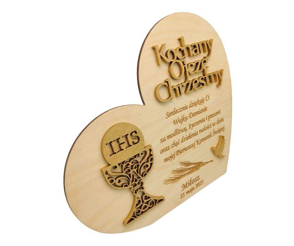 Piękne i starannie wykonane podziękowanie dla Ojca Chrzestnego oraz Matki Chrzestnej (dostępne na innym ogłoszeniu). Statuetka ma wykonany indywidualny grawer na życzenie osoby kupującej. Lakierowane elementy są koloru złotego co podnosi elegancję ozdoby. Podziękowanie podparte jest również od tyłu dzięki czemu może ono stanąć na półce i pełnić rolę estetycznej pamiątki i ozdoby. Dokładne informacje o produkcie: Materiał z jakiego wykonana jest statuetka to sklejka brzozowa 3mm Wymiary serca: 17,5cm x 16cm, Elementy klejone są już do podziękowania więc otrzymają Państwo gotowy produkt do wręczenia. Jedynie trzeba wsunąć podpórkę jeżeli zaistnieje taka potrzeba.