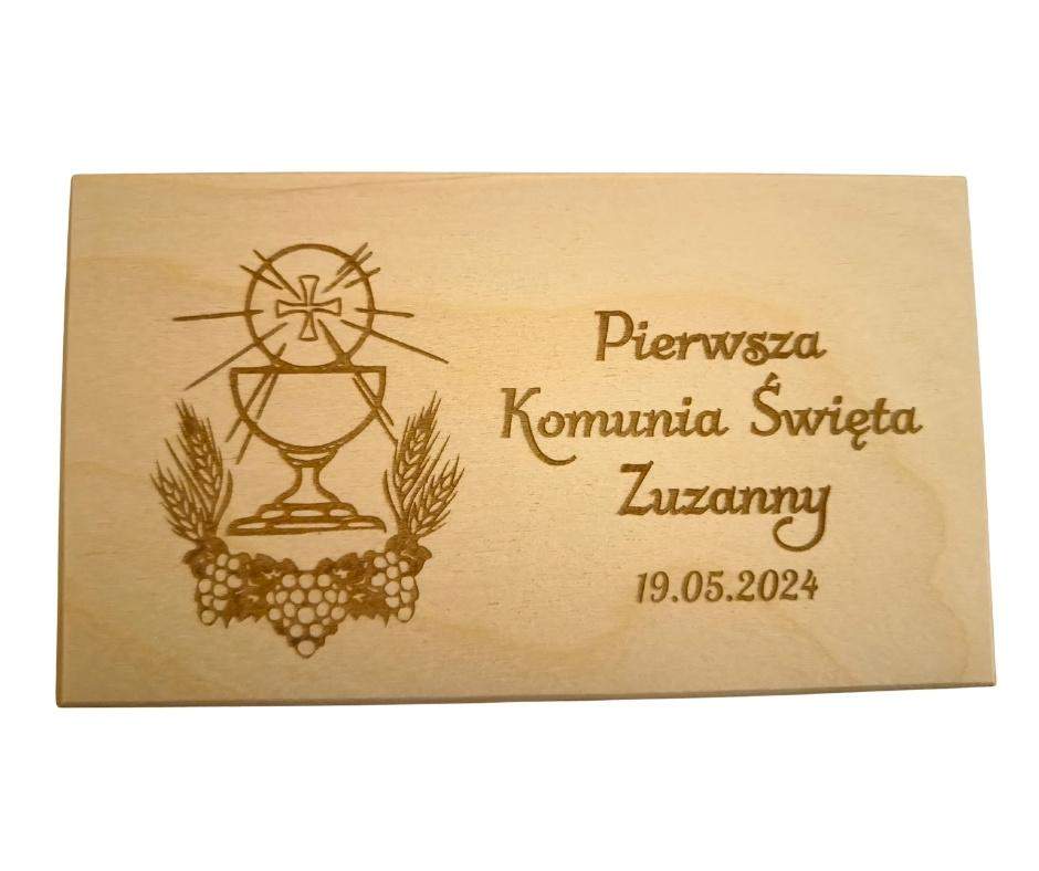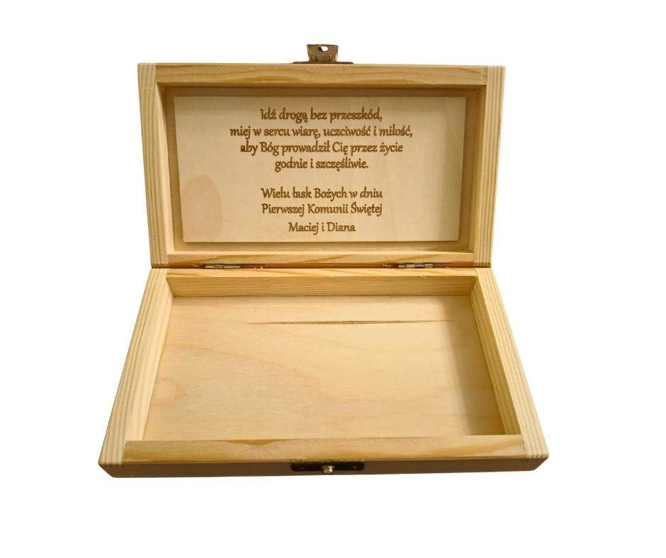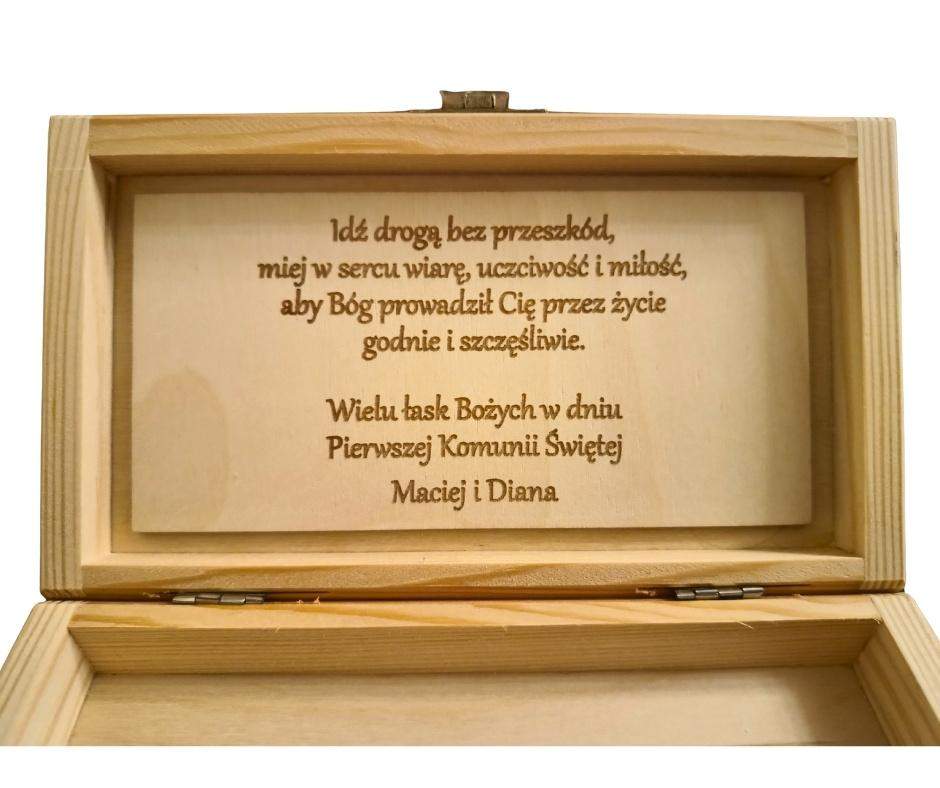 Pudełko drewniane z grawerem. Jest to pudełeczko z solidnego drewna wraz z wieczkiem ze sklejki. Zapięcie metalowe na klips. Wewnątrz tabliczka z życzeniami.