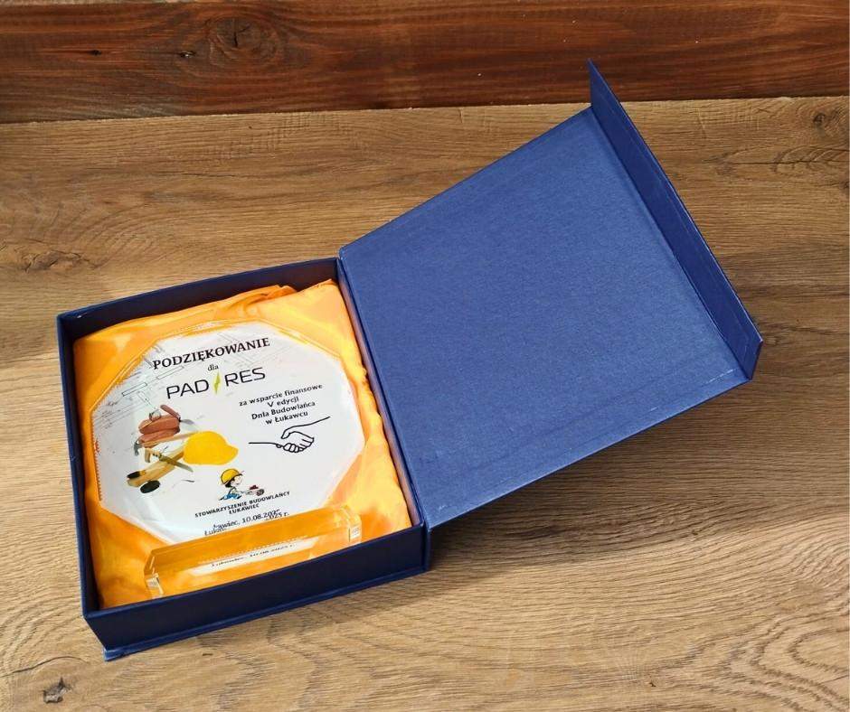 Standardowo w zestawie z pudełeczkiem transportowym tekturowym. Pudełeczko tekturowe nie podlega dodatkowej personalizacji. Tylko kolor dostarczony przez producenta (zazwyczaj granatowy) z wypełnieniem materiał + styropian.