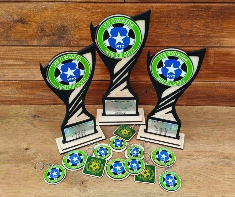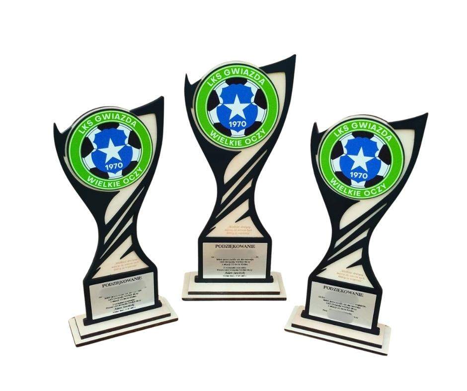 Materiał Sklejka drewniana 6mm połączona z lakierowanymi elementami ze sklejki 3mm. Statuetka dzięki swojej warstwowej budowie dodatkowo daje efekt przestrzeni. Nadruk logo (lub dowolnej grafiki) wykonany jest na płycie drewnianej. Grawer na laminacie grawerskim na dużej tabliczce. Możliwy grawer na elemencie drewnianym (widocznym na zdjęciach). Dobrze się tutaj prezentuje sentencja lub pozycja finalisty (np. 1,2,3 miejsce)